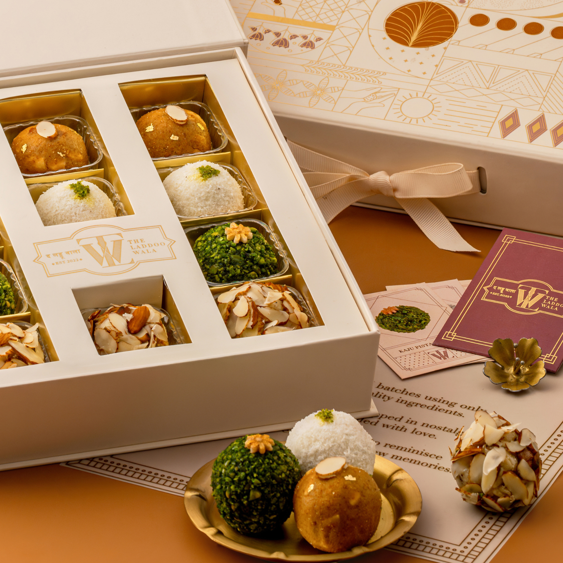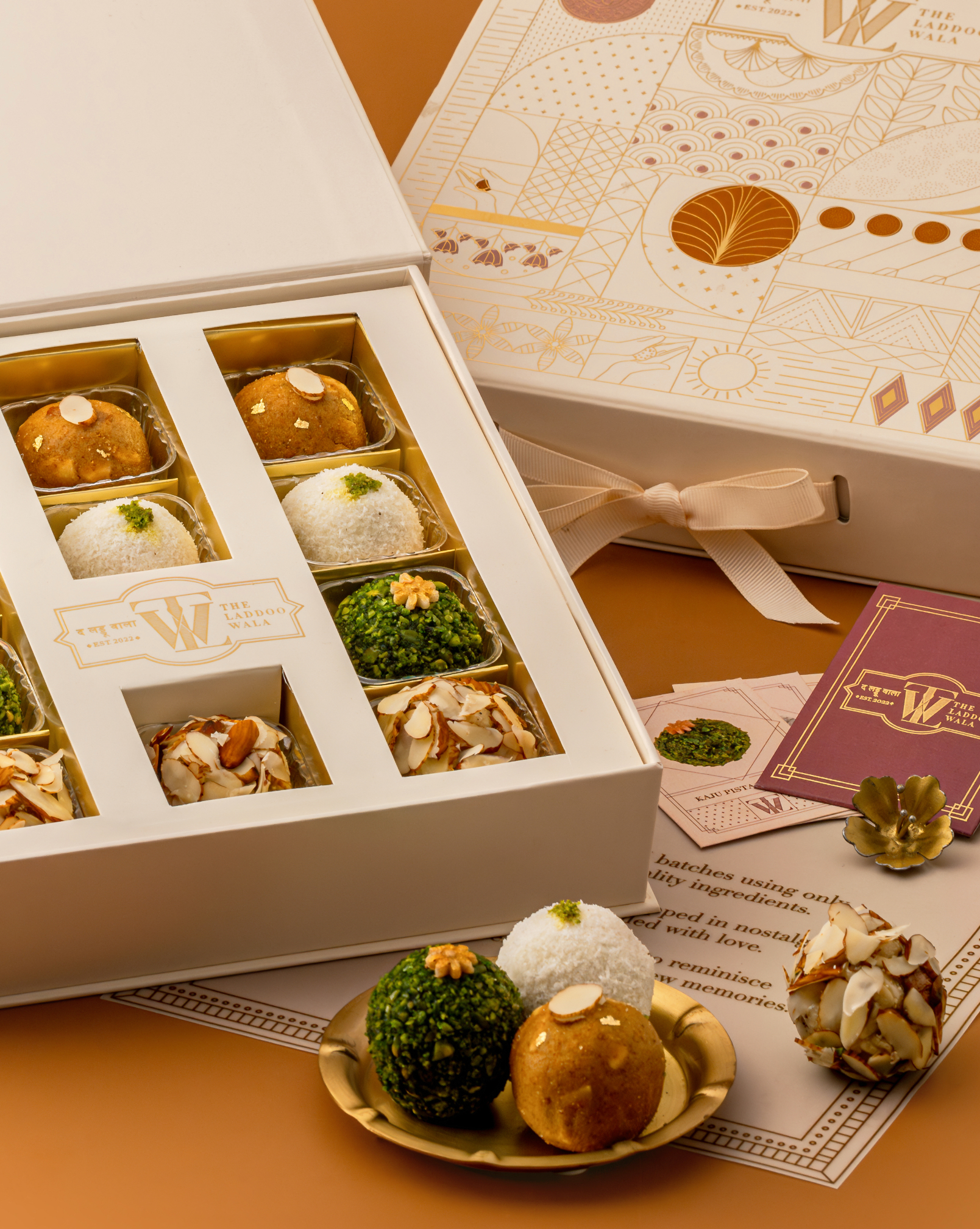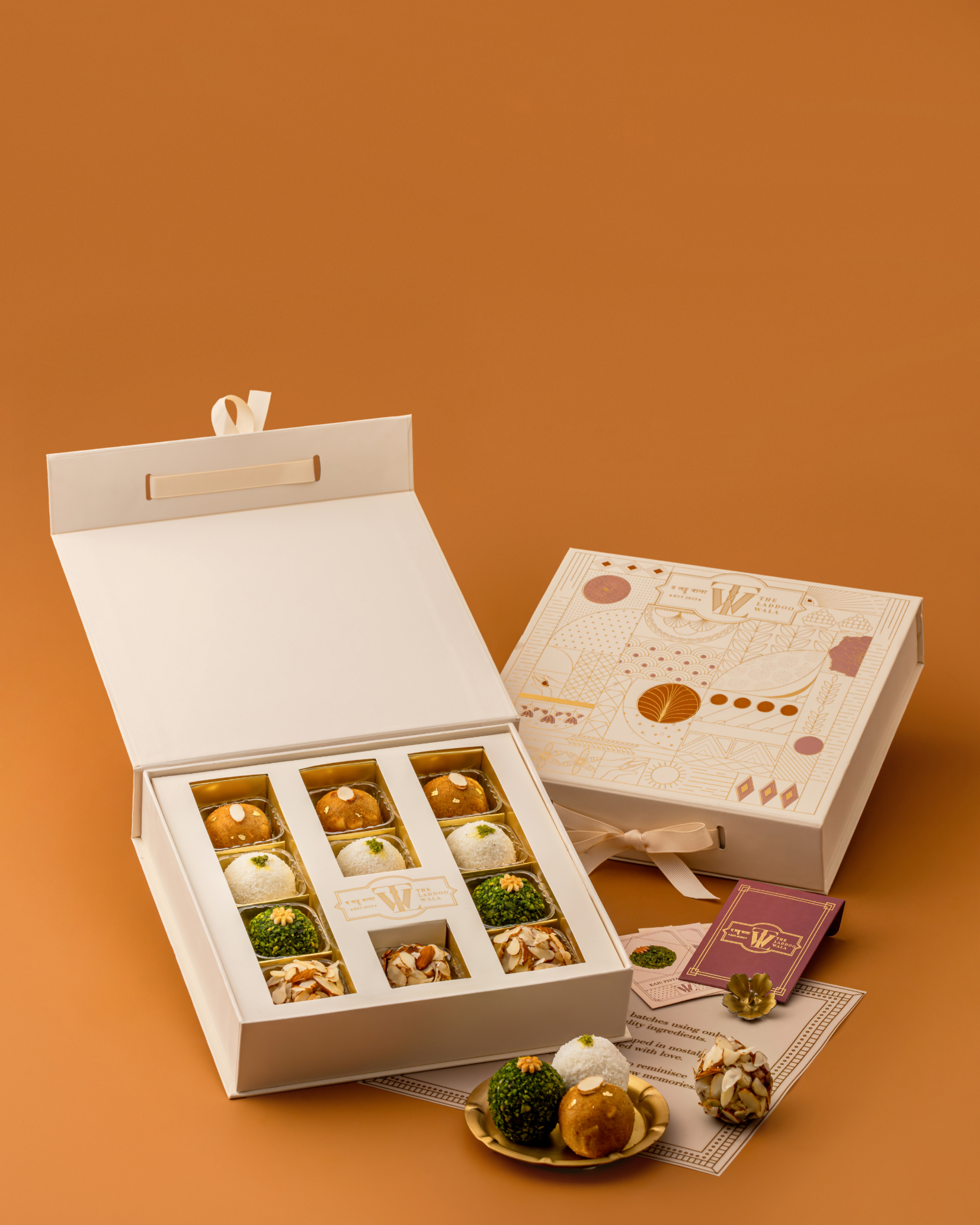 On the eighth night of its retreat, the moon curves into a gentle silver smile, perhpas enticed by the thought of the hand-rolled sweet treats inside this box. The laddoos in this box mirror the beauty of the moon in their delicate round structure, luminous ingredients and lingering sweetness.