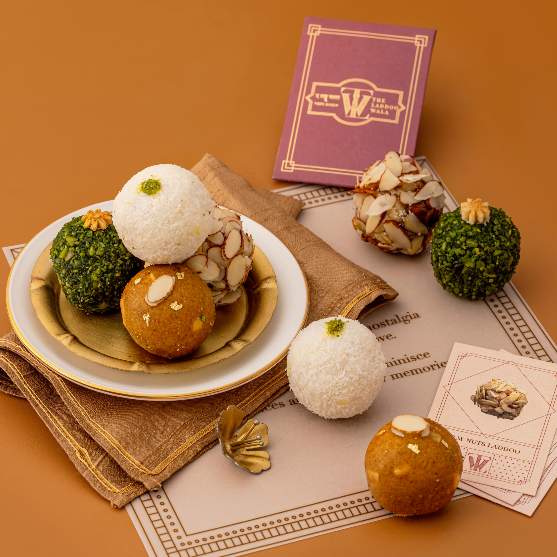 Kaju Pista Laddoo: A perfect confluence of nutty flavours, this laddoo has eclectic dry fruits stuffed into smooth cashew paste, encrusted with crushed pistachio. Topped with an edible flower with gold dust to please your senses.