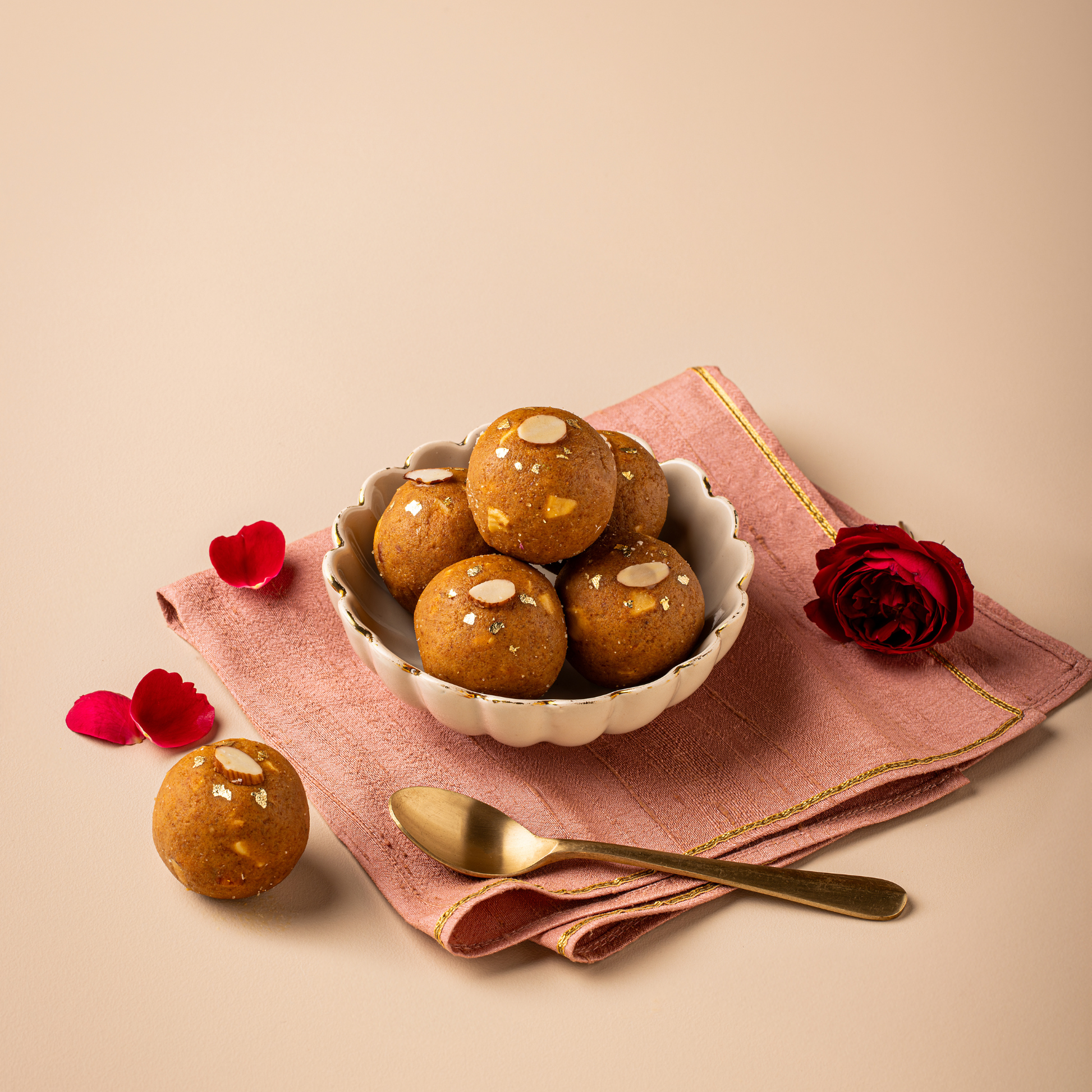 Besan Mewa Laddoo With Gold Warq: The smoky taste of laboriously roasted gram flour offset by nutty almonds gives this classic, irresistible laddoo made in pure ghee a smooth yet crunchy texture. Premium Sweet made with pure ghee and carefully sourced raw ingredients.