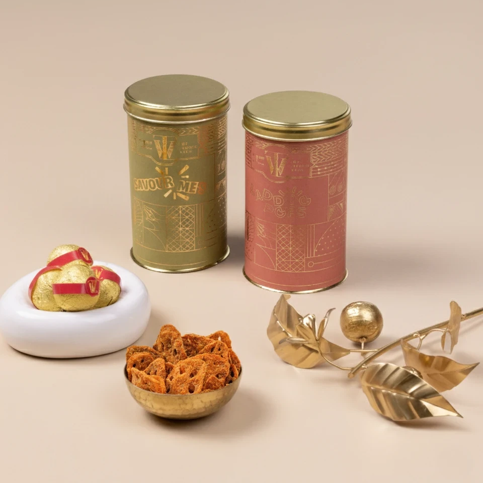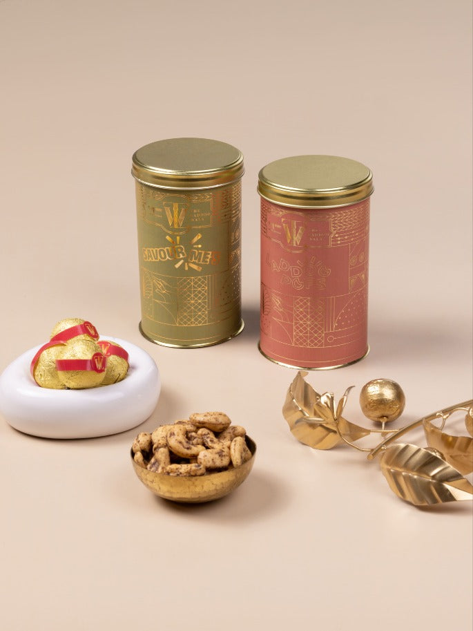 The Bloom Combo brings together the wholesome sweetness of dates and walnuts with the light, seasoned crunch of crispy lotus stem. The richness of dates blends seamlessly with the earthy nuttiness of walnuts, creating a naturally indulgent bite, while the lotus stem adds a playful, savoury balance. This thoughtful pairing of sweet and savoury flavours comes together in perfect harmony, offering comfort, crunch, and a touch of elegance in every tin.