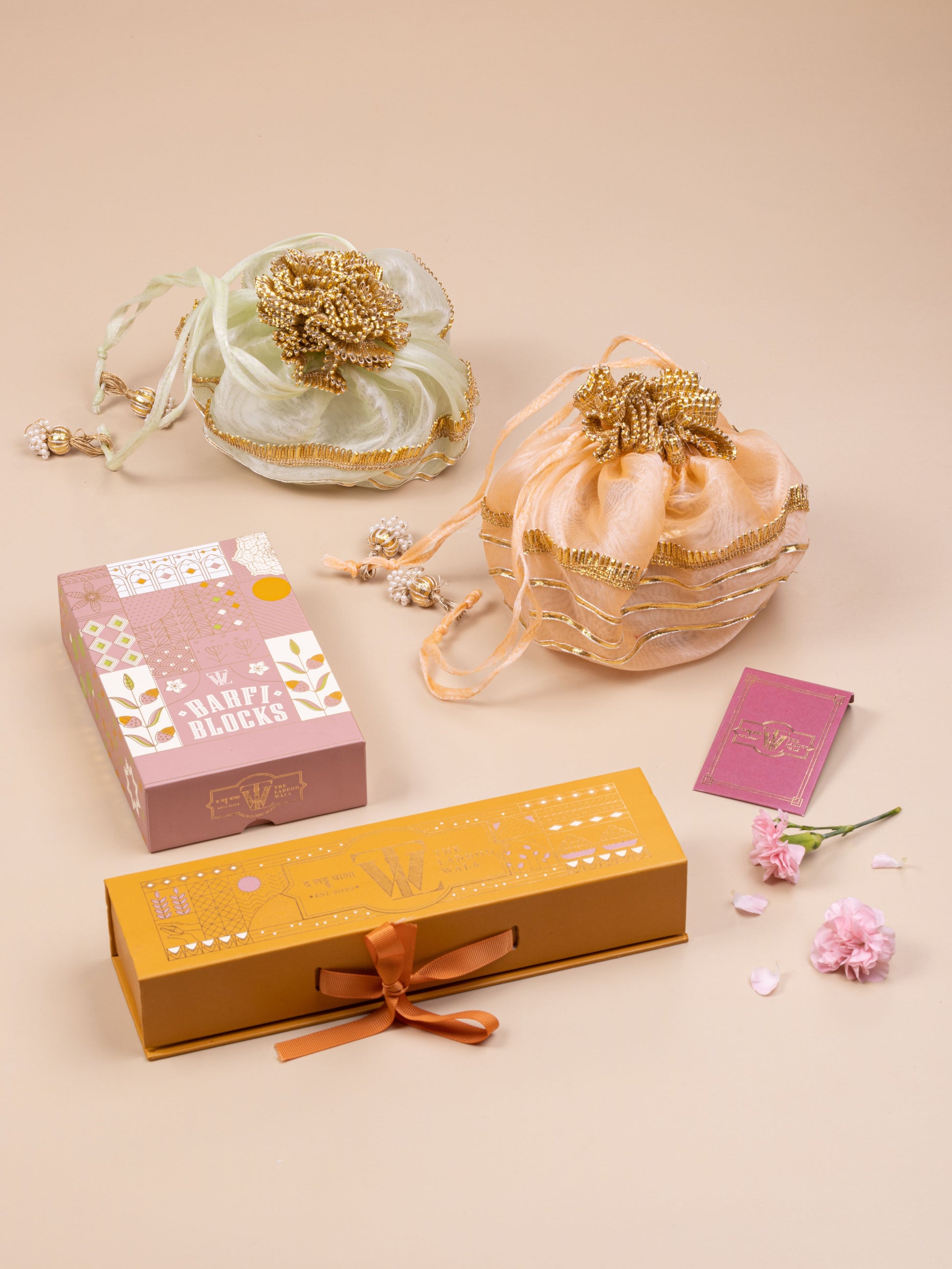 Potli of Feni: An elegant potli brimming with delicate, golden feni – a timeless indulgence crafted to add sophistication and sweetness to your celebrations.