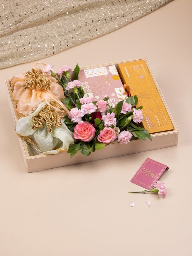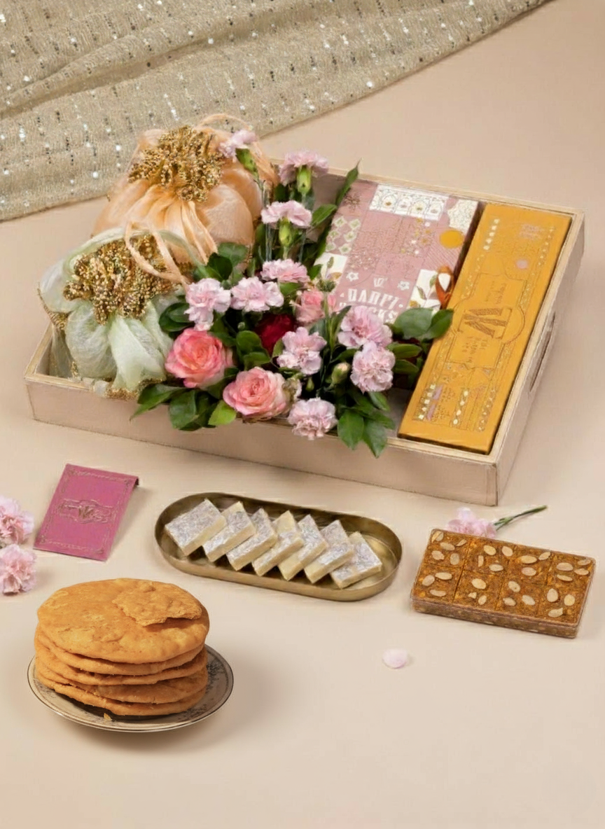 The joy of seeing the moon after a day of fasting and anticipation is a moment worth celebrating with hand-rolled flavors that become part of memories shared with loved ones. The silver-white kaju katli in this tray echoes the luminous moon of Karwa Chauth night, symbolizing purity and love. Fresh flowers and pastel-hued gota potlis are thoughtfully included to enhance the splendour of your celebration.