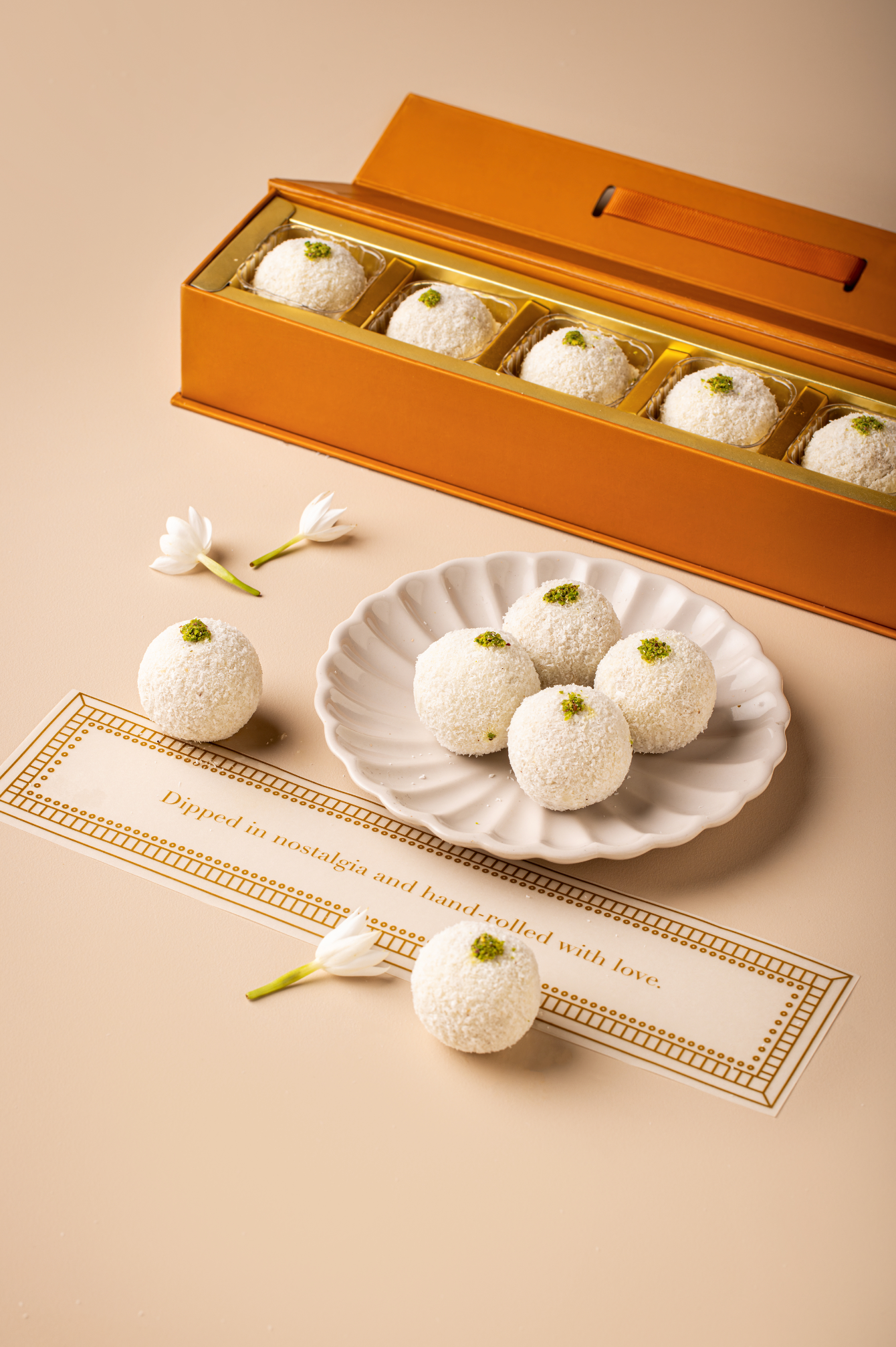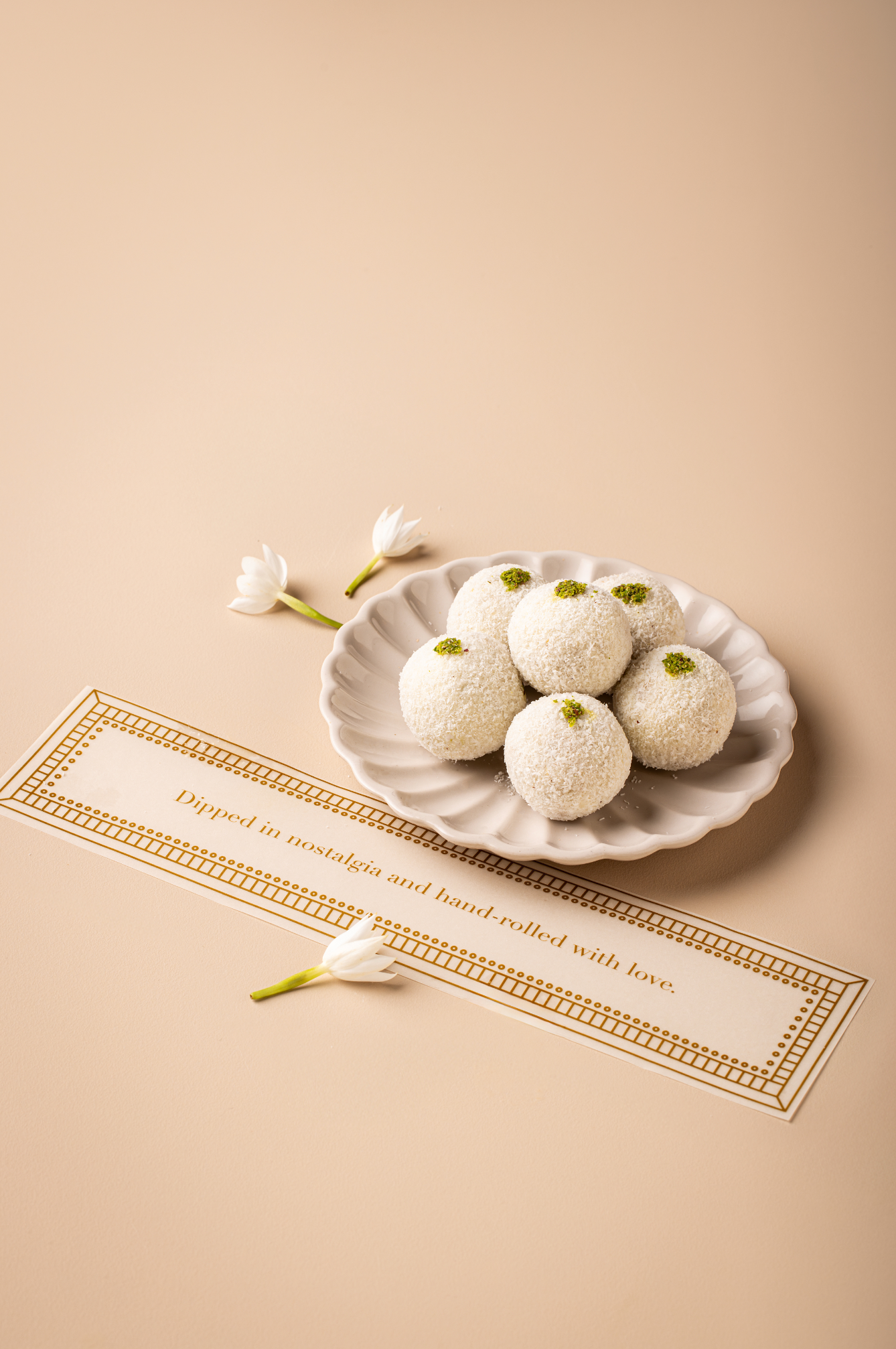 Chandni Laddoo: This variation of the classic coconut laddoo features mewa encrusted in pristine white desiccated coconut. This masterpiece offers a flavourful journey with impeccable textures. Premium Mithai made with pure ghee and carefully sourced raw ingredients.
