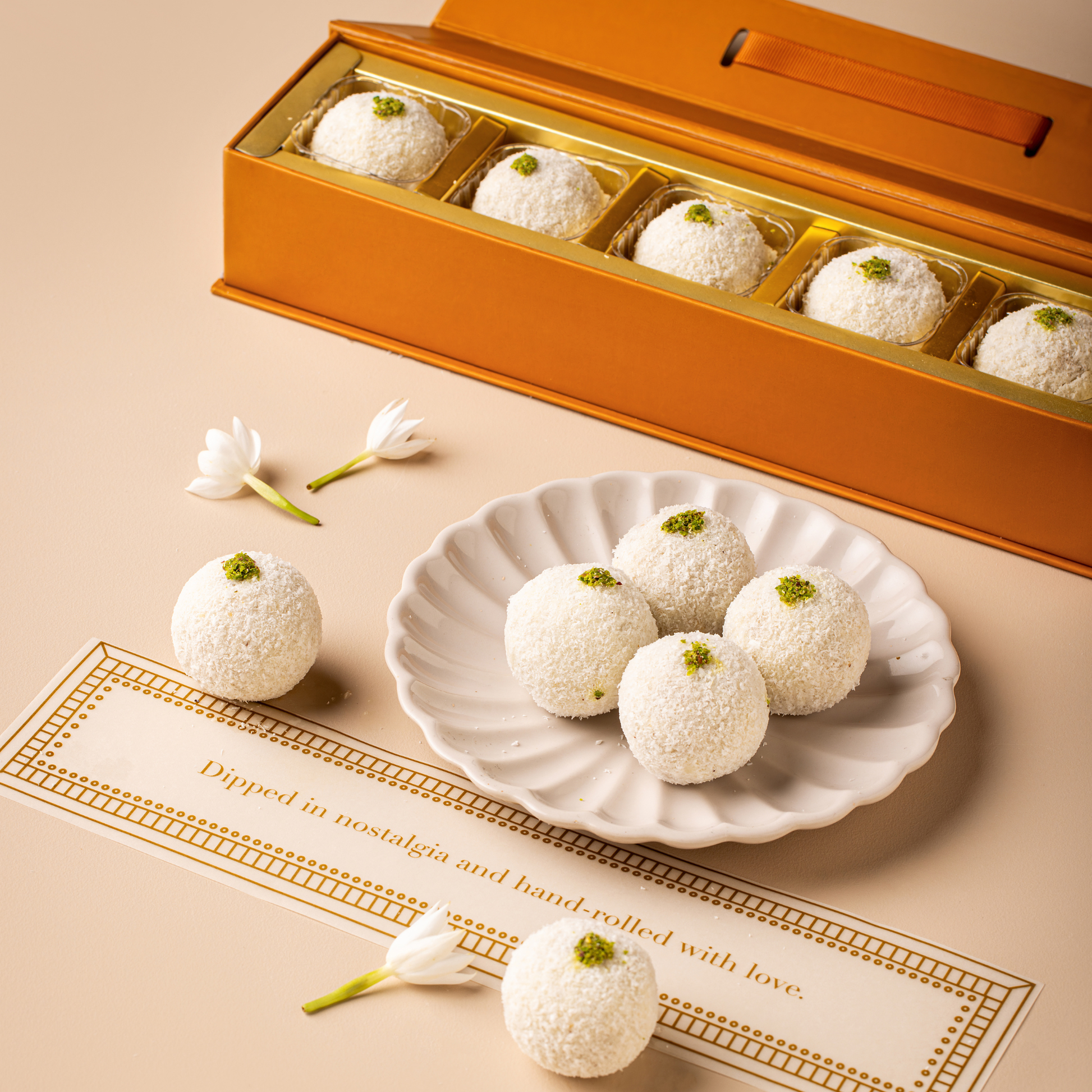 A bite of the sweets inside this Chitrakala box will take your taste buds on a delightful journey with impeccable textures. Each luxury mithai box celebrates India’s diverse culinary heritage and traditional art forms. Our classic coconut laddoo, hand-rolled in small batches, highlights the artistry of premium sweets.