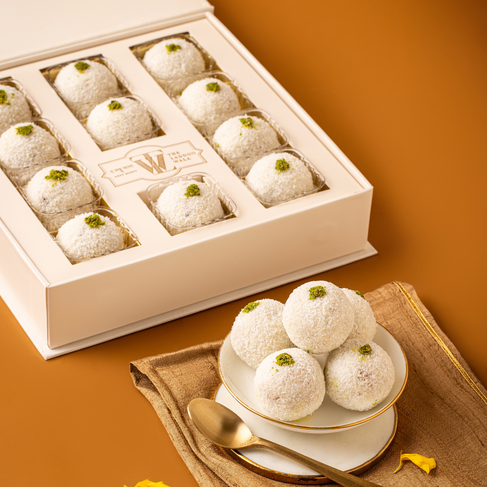 Our Chandni laddoo is a TLW twist of the classic coconut laddoo. It features mewa encrusted in pristine white desiccated coconut. Each piece sits draped in luxurious white inside our Mudra box, offering every sweet taker a flavourful journey with impeccable textures.