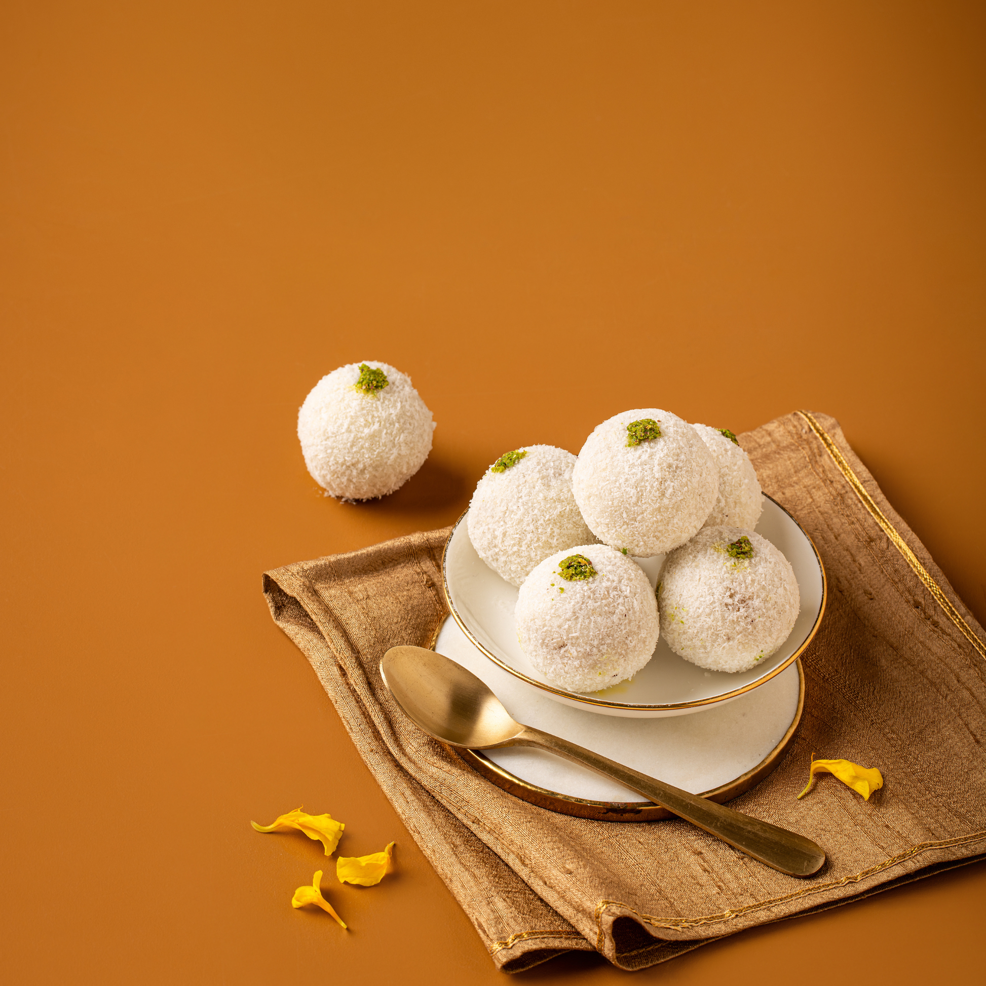 Chandni Laddoo: This variation of the classic coconut laddoo features mewa encrusted in pristine white desiccated coconut. This masterpiece offers a flavourful journey with impeccable textures. Premium Sweet made with pure ghee and carefully sourced raw ingredients.