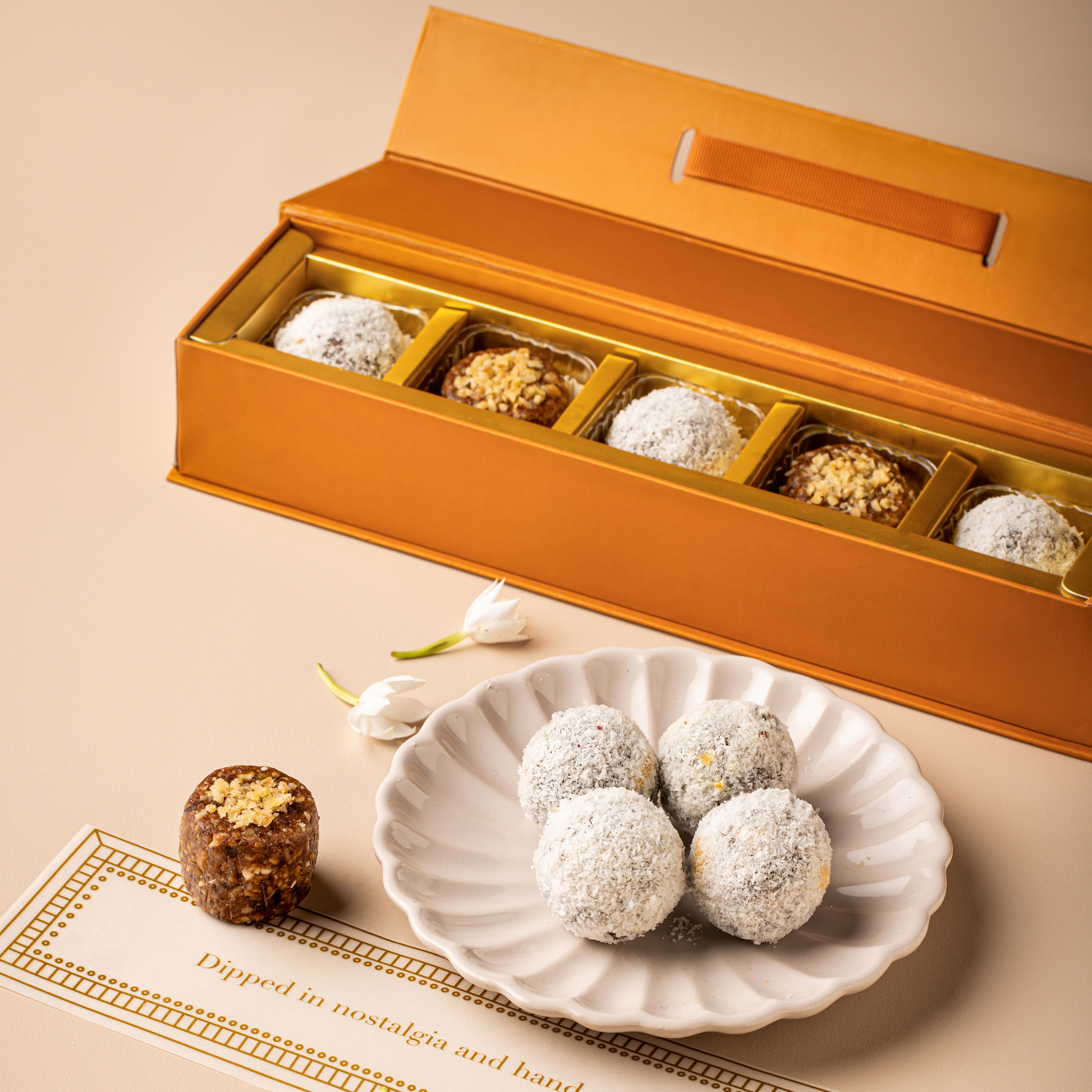 Teeming with textures of nature's bounty, this luxury mithai box draws its name from a celebrated Indian textile art form that weaves stories onto fabric using natural dyes and tools made from date palms. This exquisite handcrafted Indian sweets gift box features premium sweets - perfectly curated for those who appreciate authentic taste and artisanal craftsmanship.