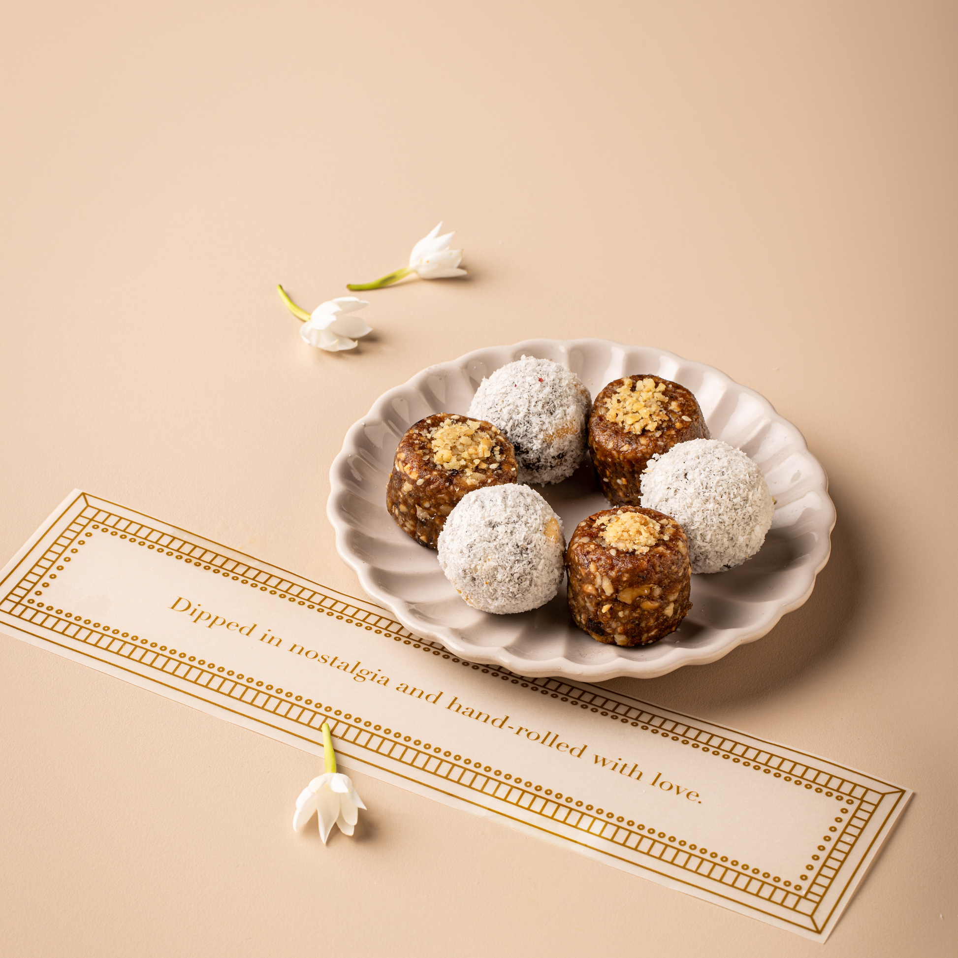Ragi Coconut: Traditional millets, desiccated coconut and nuts jostle in a crunchy carnival of nutrition filled textures and flavours to create this delicious guilt-free vegan laddoo.