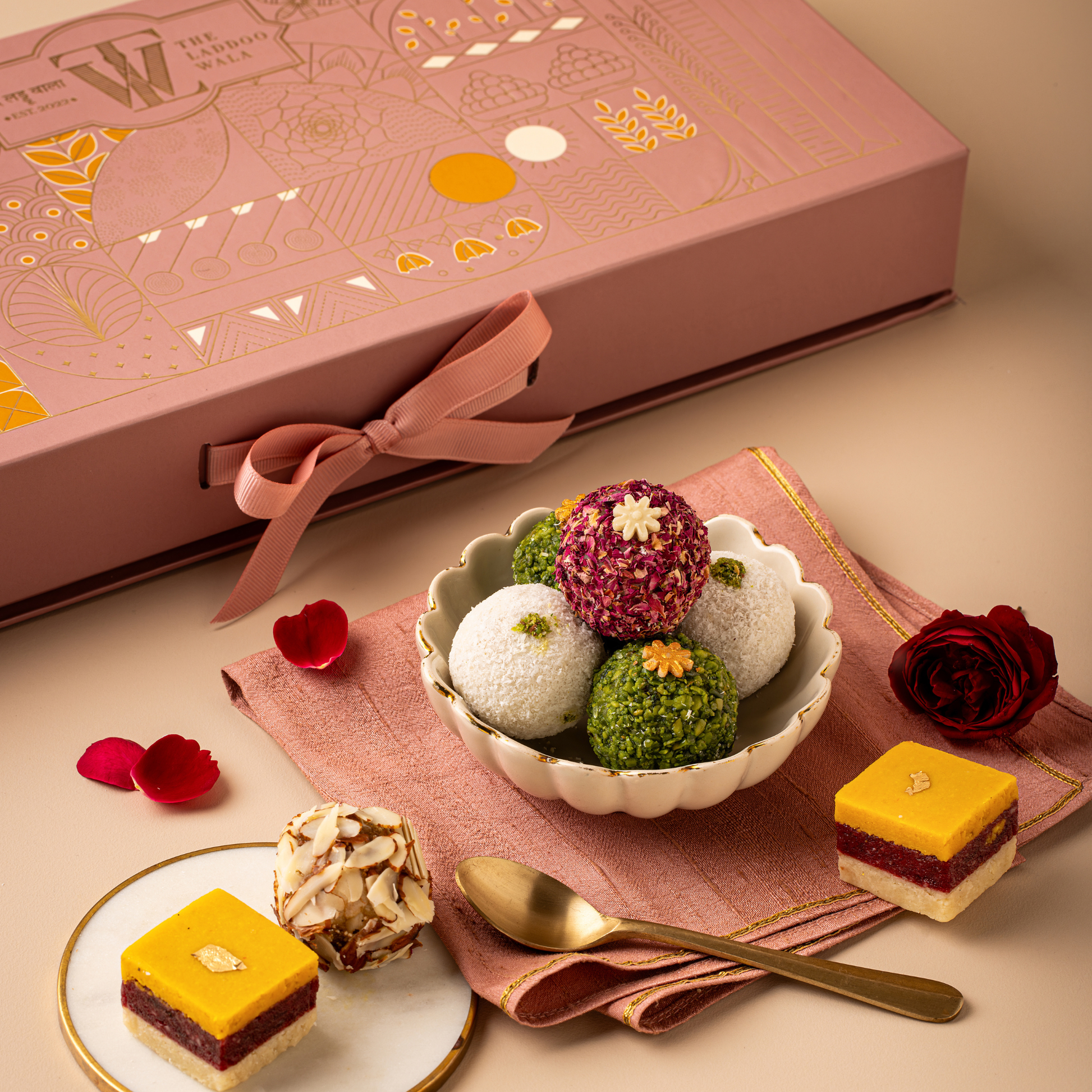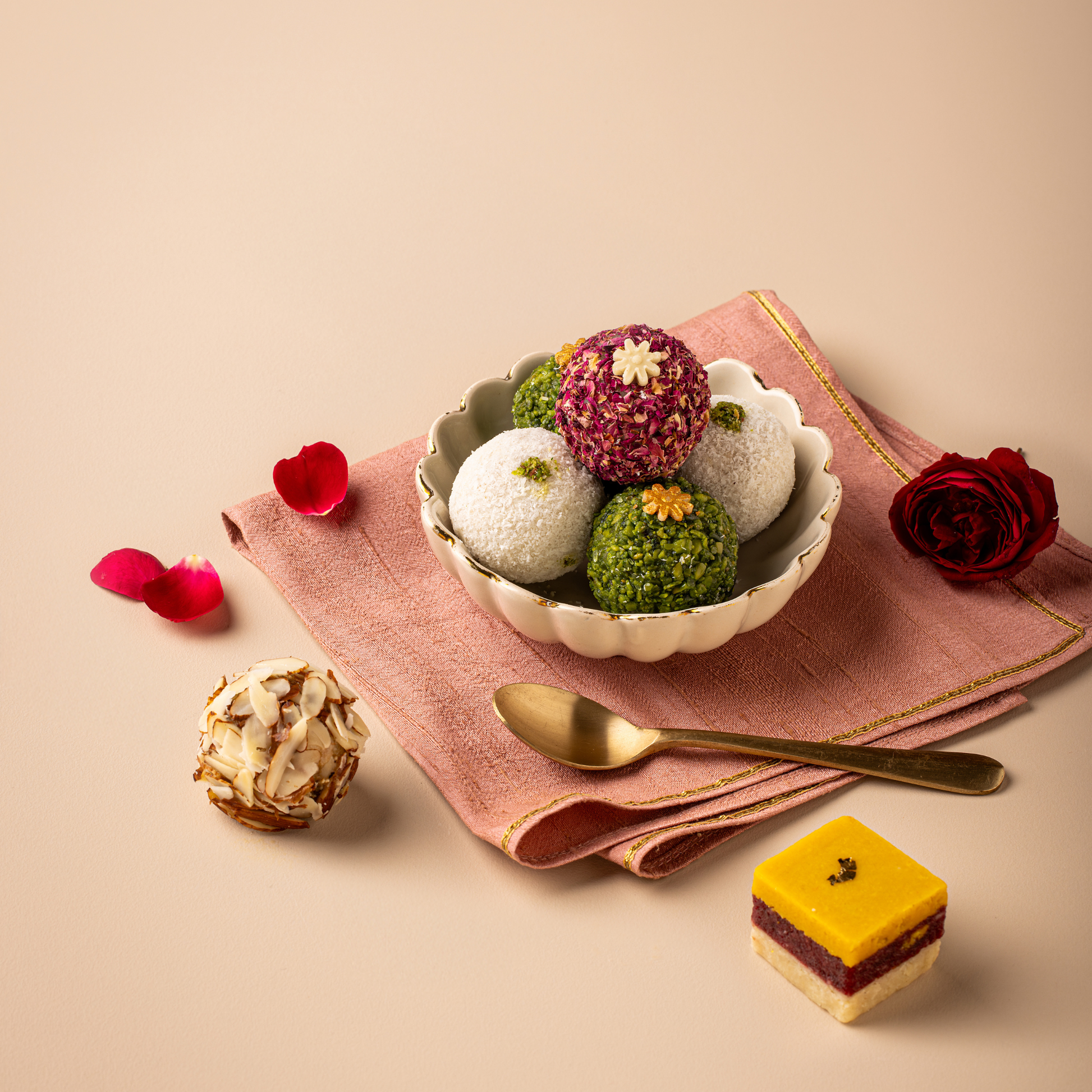 Rose Almond Laddoo: A luxury laddoo made with pure 'badaam Giri’ and rose petals. A bounty for the senses, the fragrance of roses and the crunch of almonds combine seamlessly in mild sweetness.