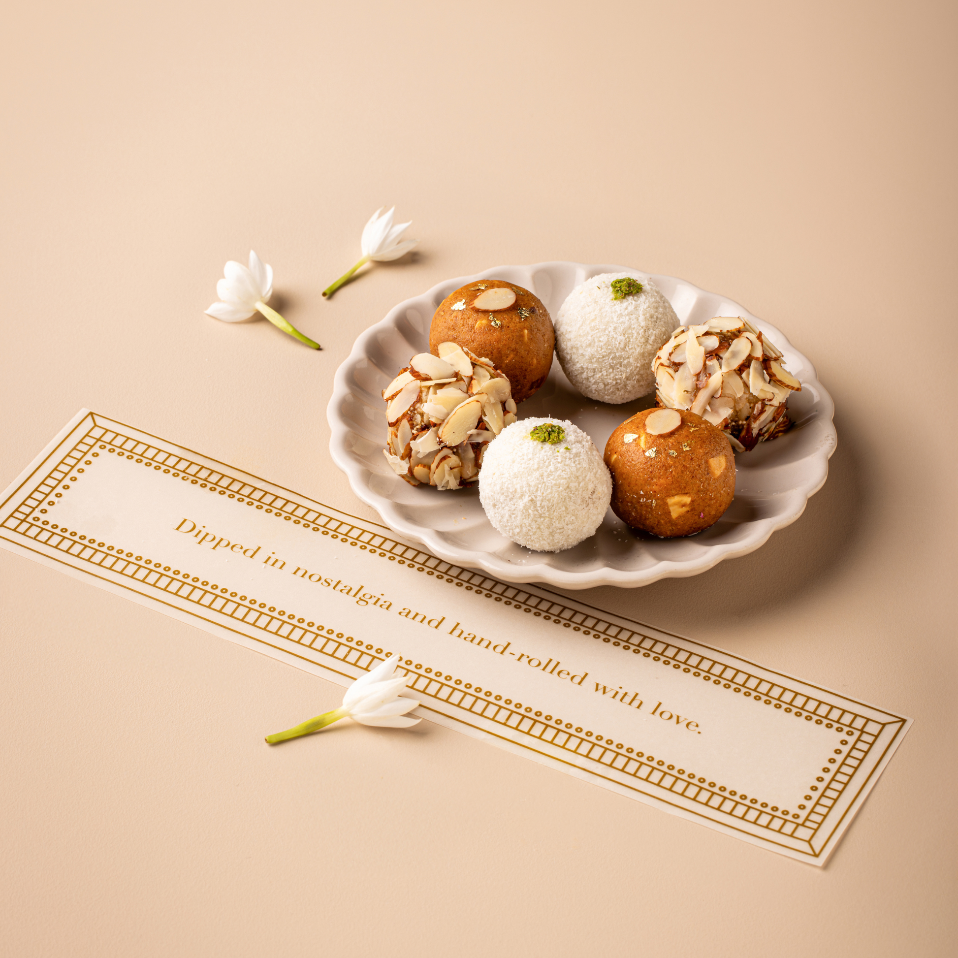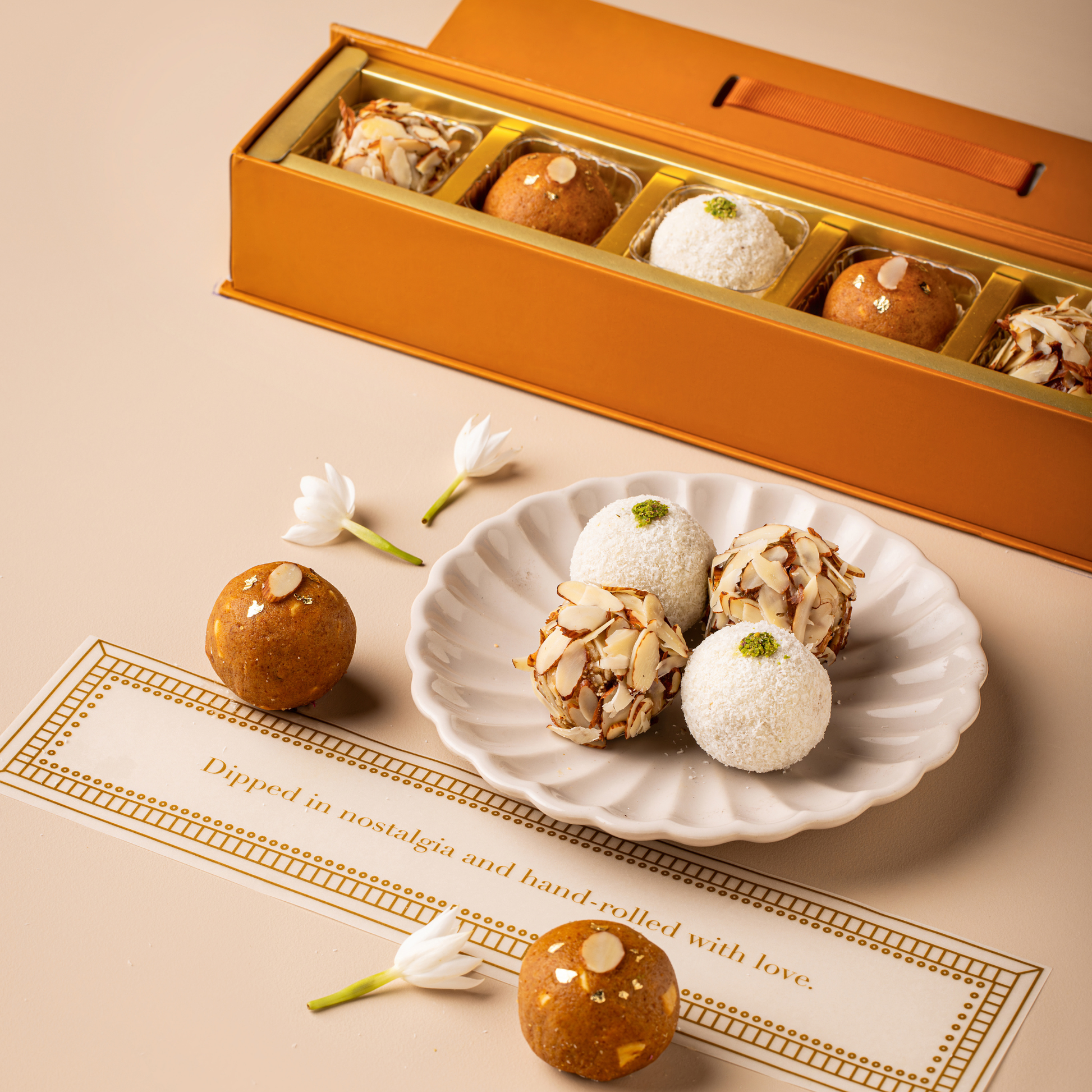 Besan Mewa Laddoo With Gold Warq: The smoky taste of laboriously roasted gram flour offset by nutty almonds gives this classic, irresistible laddoo made in pure ghee a smooth yet crunchy texture.