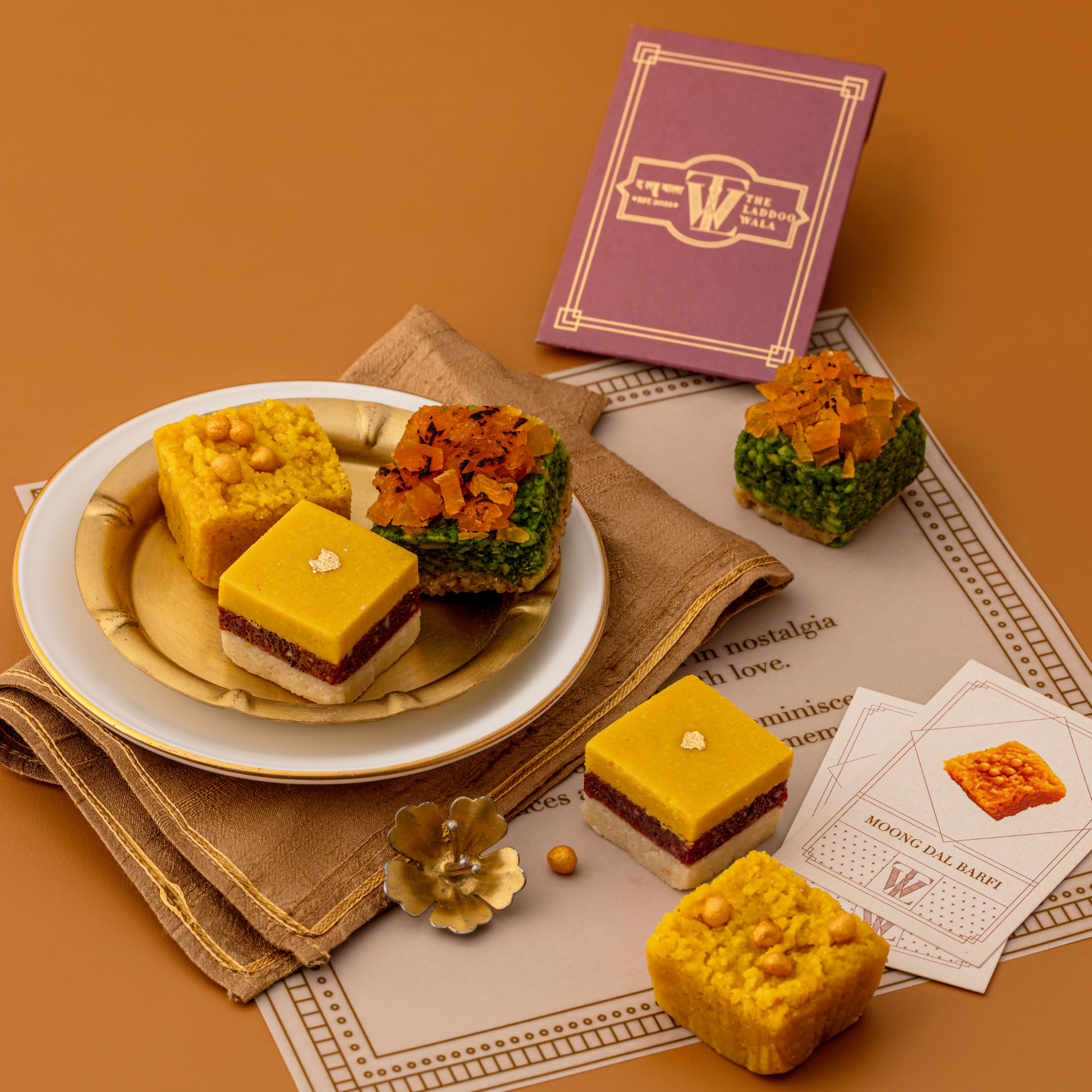 Moong Dal Barfi: This luscious Indian sweet hails from the heartland of Rajasthan. Crafted from roasted moong dal, enriched with Mawa (Khoya) and ghee. Garnished with gold pearls, it offers a delightful blend of textures and flavours, making it a beloved treat for any occasion.
