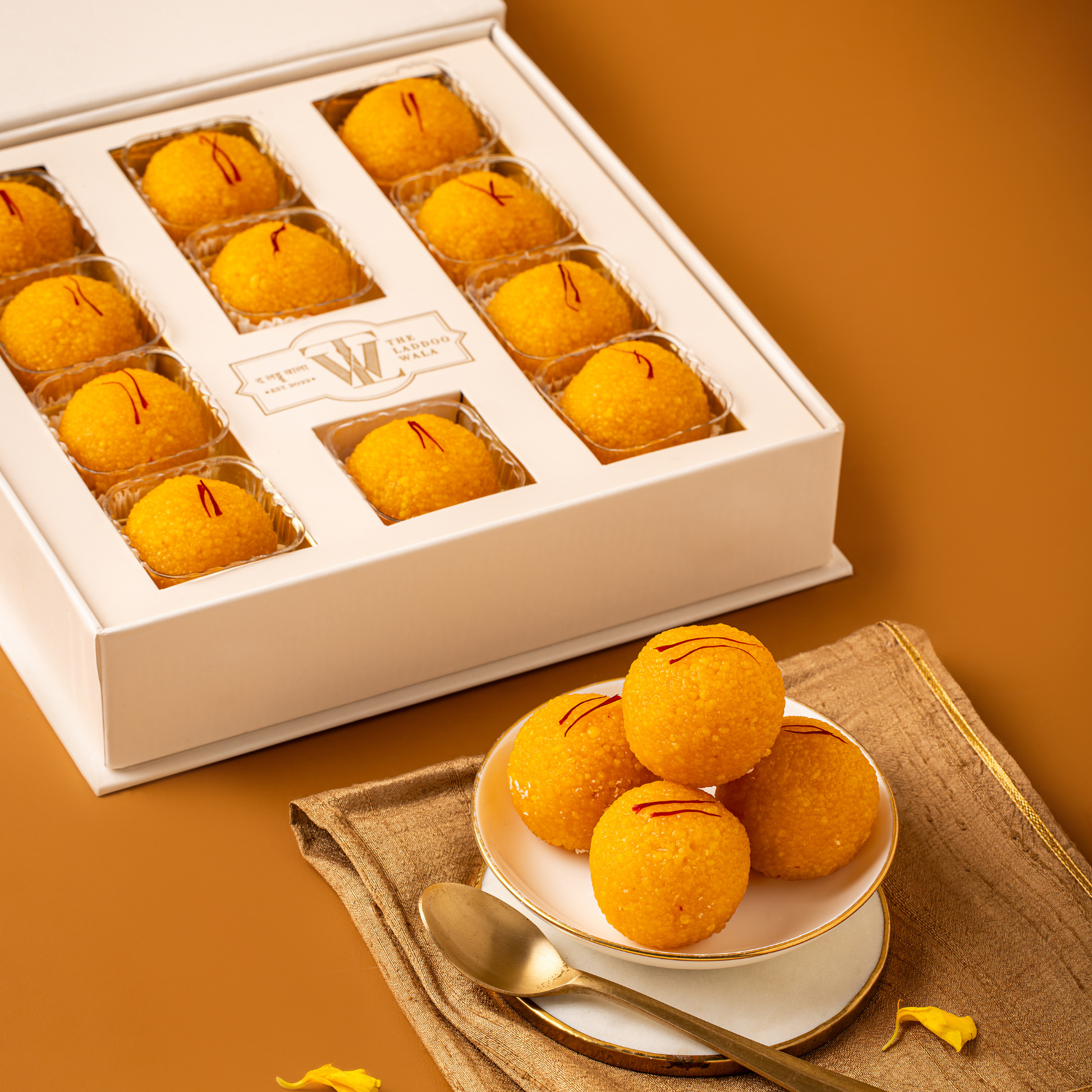 Motichoor Laddoo: ‘Moti choor’ soaked in unrefined sugar and pure saffron. Each discrete, glistening pearl or ‘moti’ clings delicately to this TLW laddoo and disintegrates into sumptuous softness with every mouthful. Premium Sweet made with pure ghee and carefully sourced raw ingredients.
