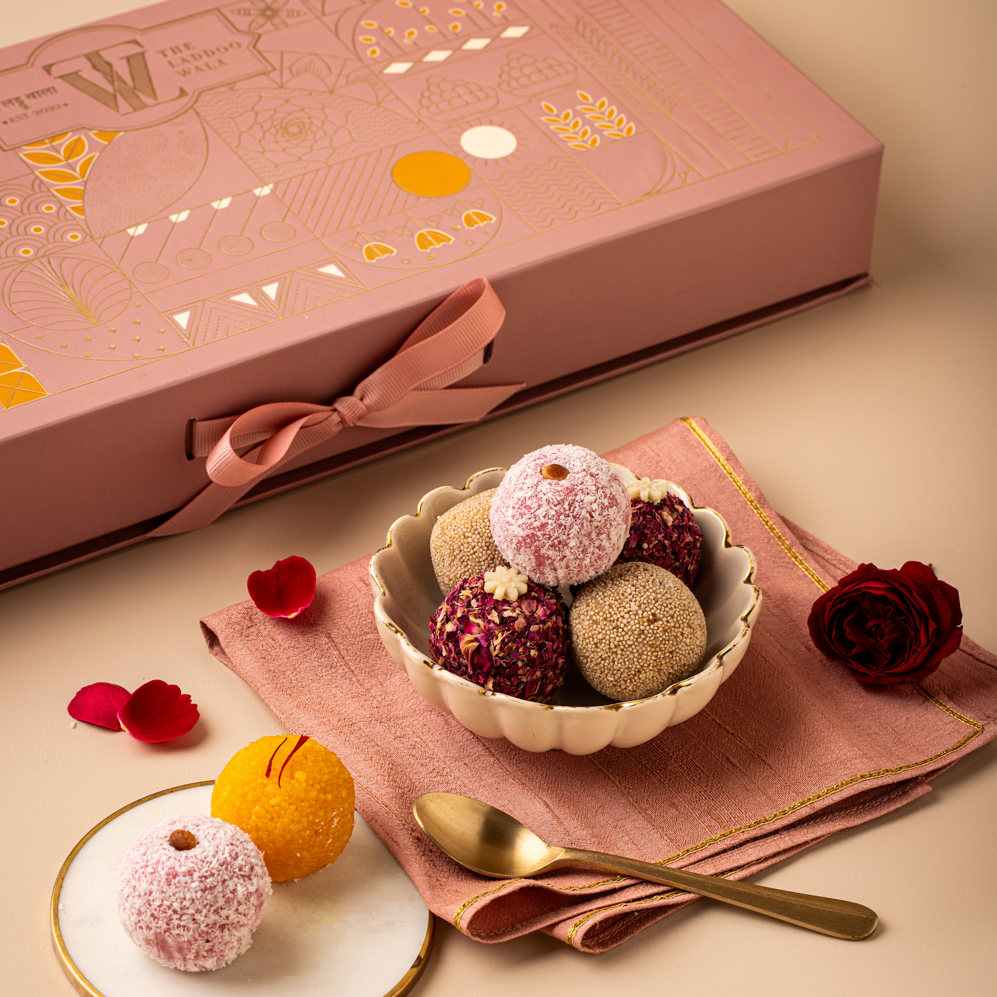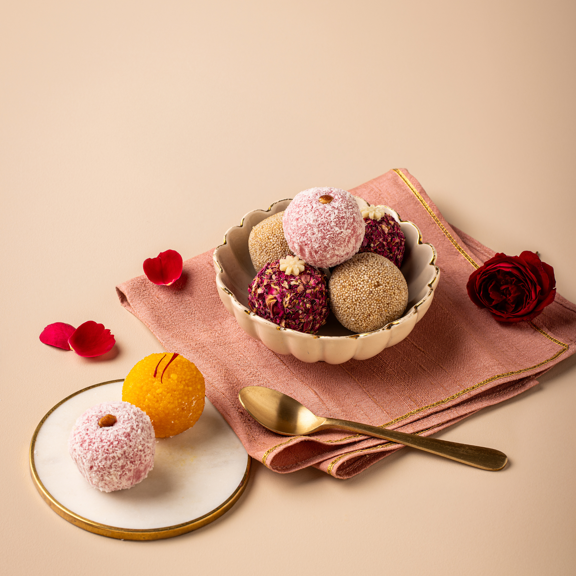 Rose Almond Laddoo: A luxury laddoo made with pure 'badaam Giri’ and rose petals. A bounty for the senses, the fragrance of roses and the crunch of almonds combine seamlessly in mild sweetness.