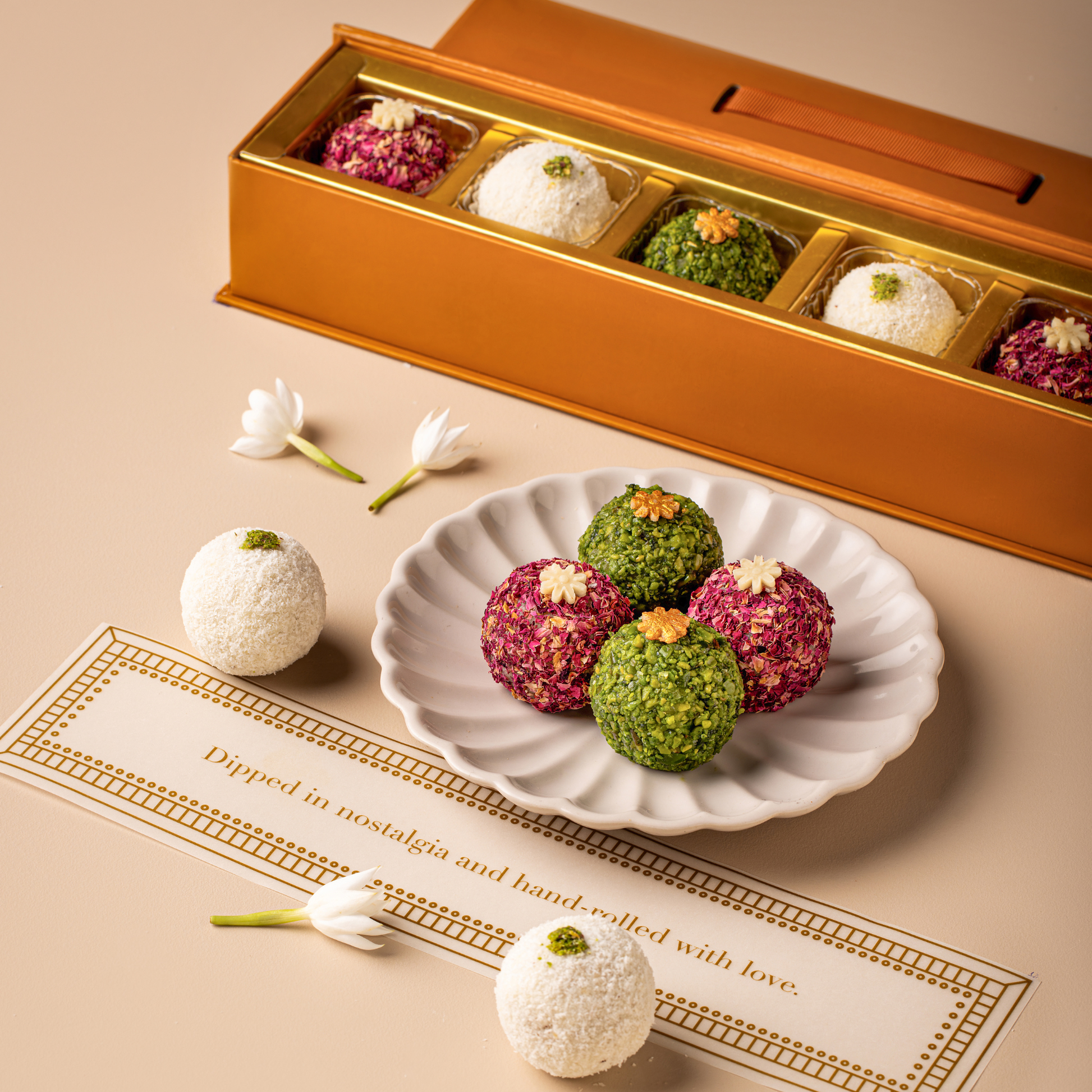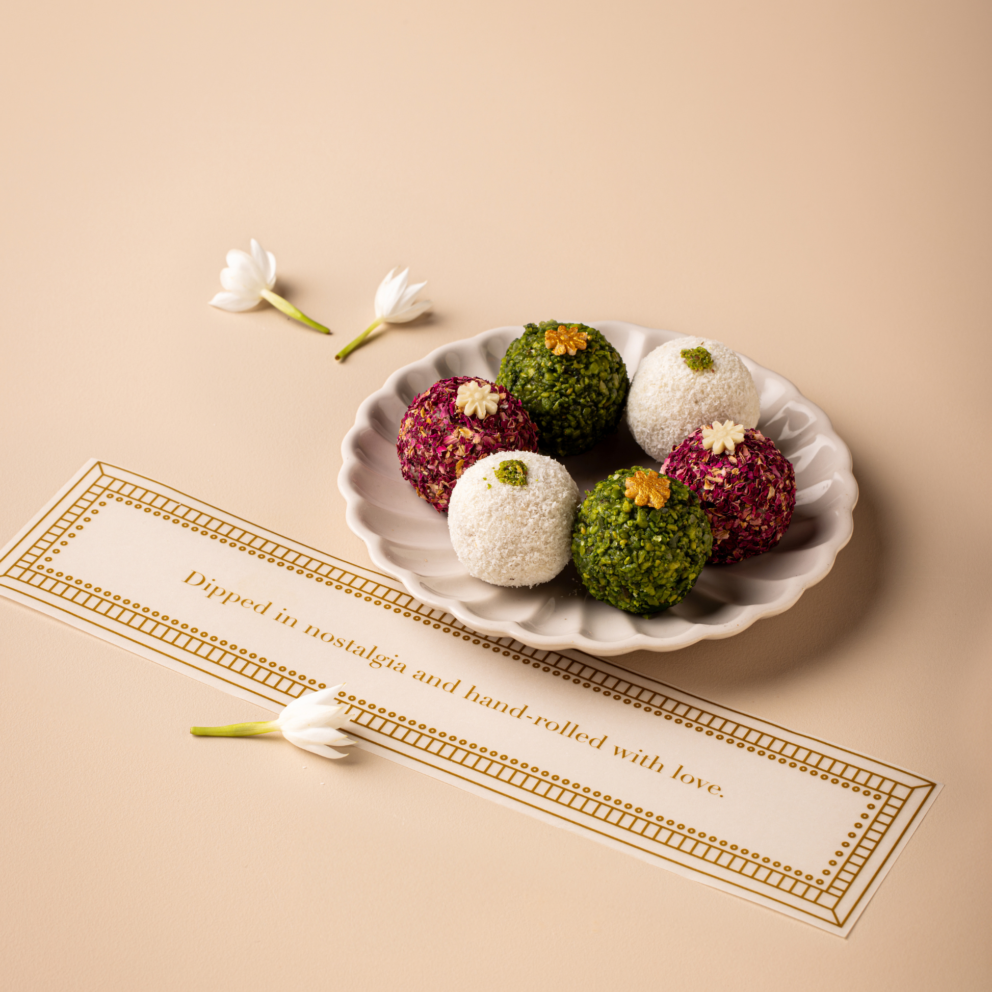 Rose Almond Laddoo: A luxury laddoo made with pure 'badaam Giri’ and rose petals. A bounty for the senses, the fragrance of roses and the crunch of almonds combine seamlessly in mild sweetness.